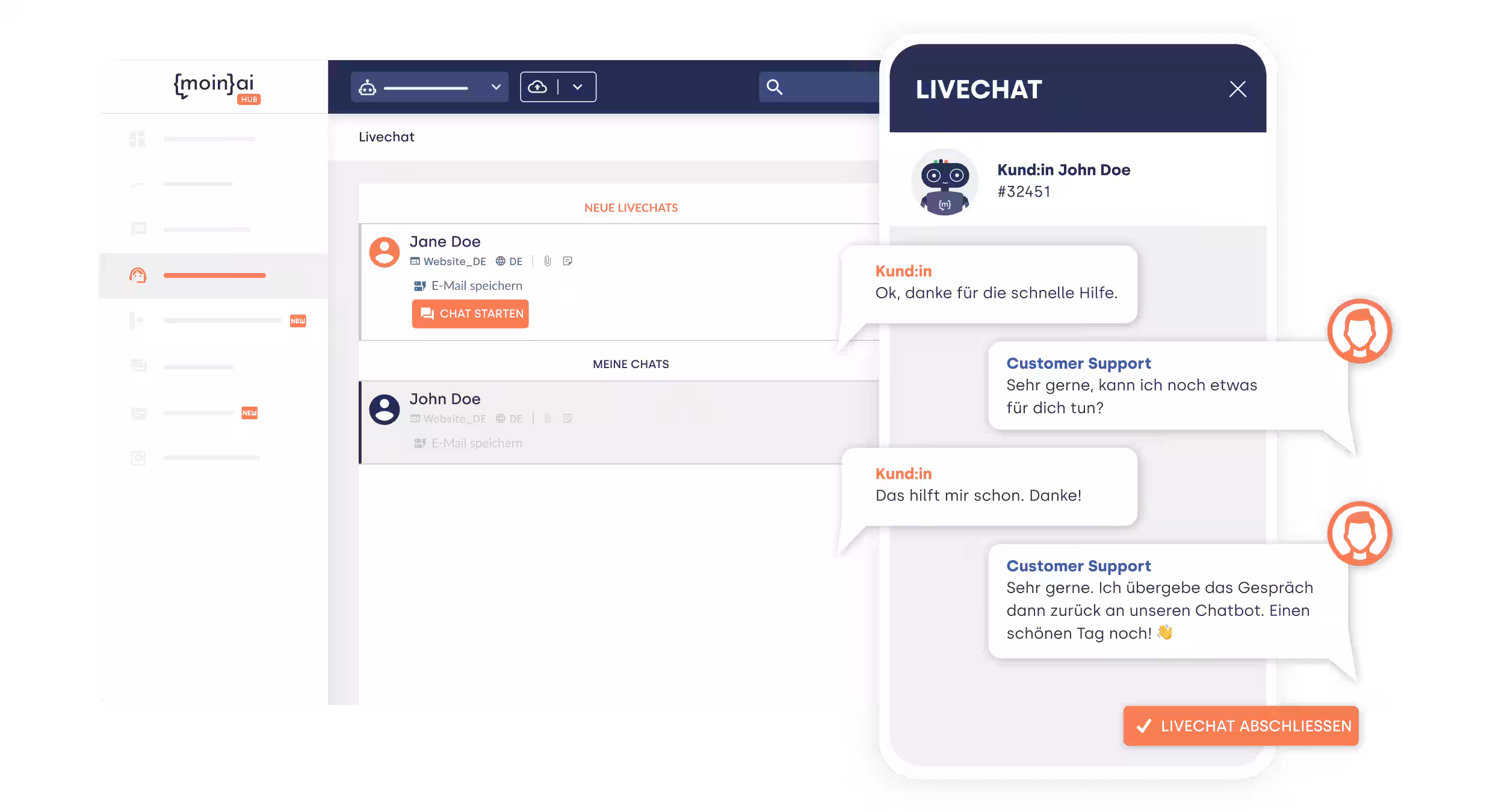 moinAI ist die Plattform für automatisierte Kundenkommunikation im Marketing, Sales und Kundenservice. Mit Chatbot, Live-Chat, AI Agents, GenAI und Knowledge Base können Unternehmen rund um die Uhr, schnell und effizient mit Kunden und Kundinnen auf der Website kommunizieren.