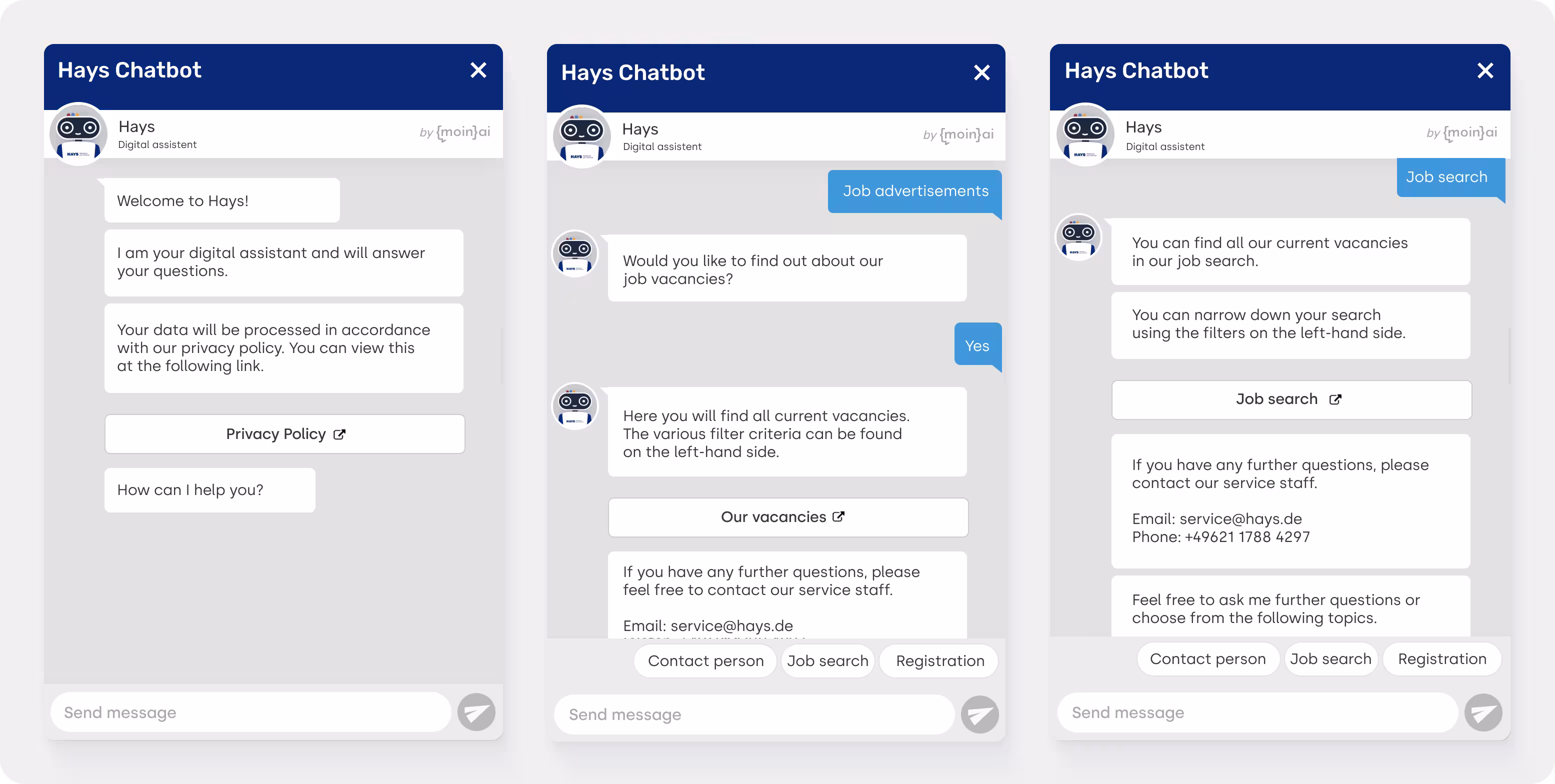 The moinAI Chatbot Has been available at Hays for a long time in both German and English on many various sub-pages of the website in use, such as on the homepage, the landing page for the job search, the FAQ or the subpage for companies. Thanks to the chatbot, Hays is able to to process the volume of international applications automatically and to relieve customer service without reducing the quality of applicant management.